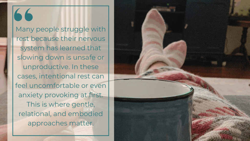 Many people struggle with rest because their nervous system has learned that slowing down is unsafe or unproductive. In these cases, intentional rest can feel uncomfortable or even anxiety provoking at first. This is where gentle, relational, and embodied approaches matter.